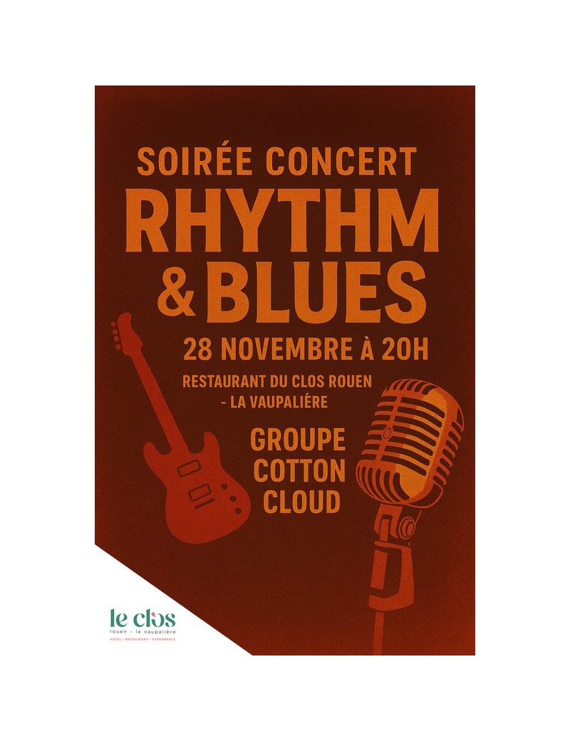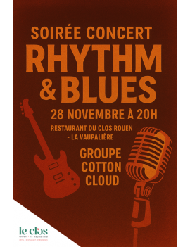 Réservez vite vos places pour votre Soirée concert Rhythm ‘n’ Blues avec le groupe Cotton Cloud au restaurant du Clos Rouen - La Vaupalière.
